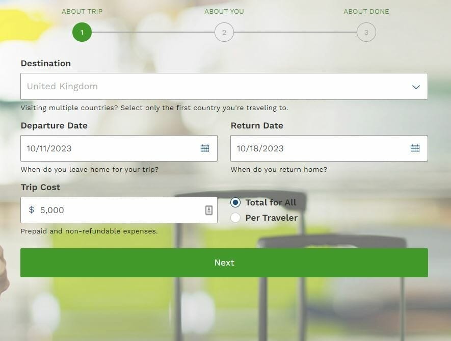To start, you head to the Travel Insurance Master homepage here, and then plugin your destination (United Kingdom), and a few other trip details.