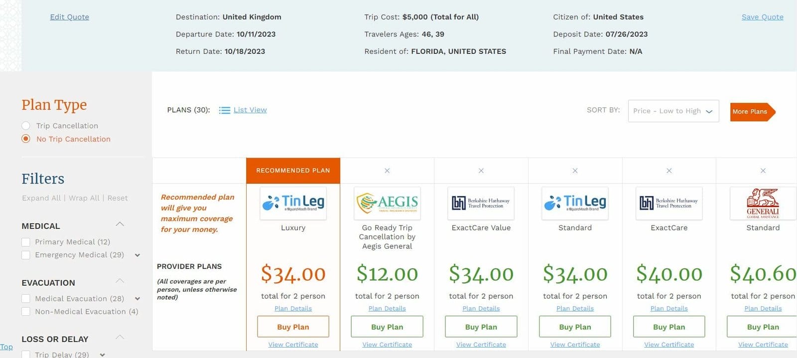 You can see on the sidebar that you can filter by what’s included in the plan to make sure you have one that includes (or doesn’t include) things like trip cancellation, emergency medical cover, trip delay, etc.