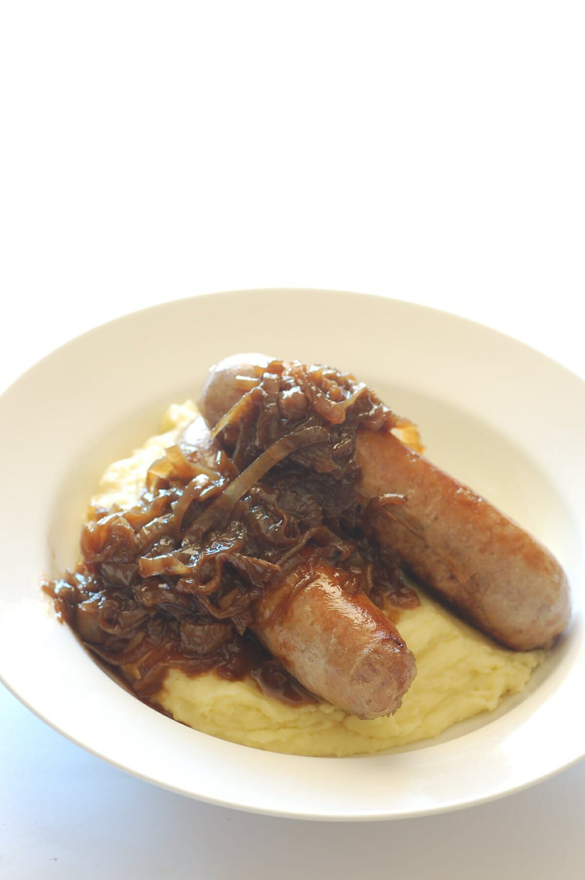 The sausages are usually either pork or beef, and often served with something like onion gravy.