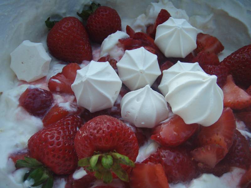 It’s sort of a deconstructed strawberry trifle, and it’s though that it’s called “Eton” mess because it originated in Eton College.