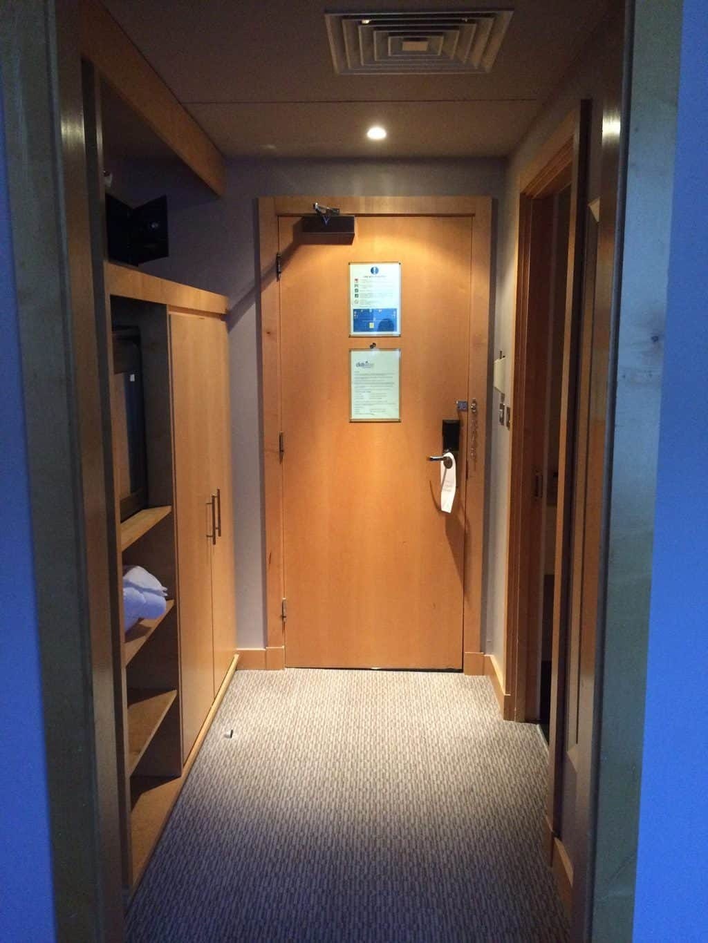 You first entered into a mini-hallway, complete with a safe, ironing board, trouser press, coffee maker, small fridge, and a small closet.