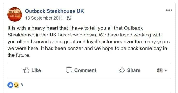 While doing a bit of digging for this article, I found a very sad post from Outback Steakhouse UK in 2011 letting its loyal readers know that it had closed down.
