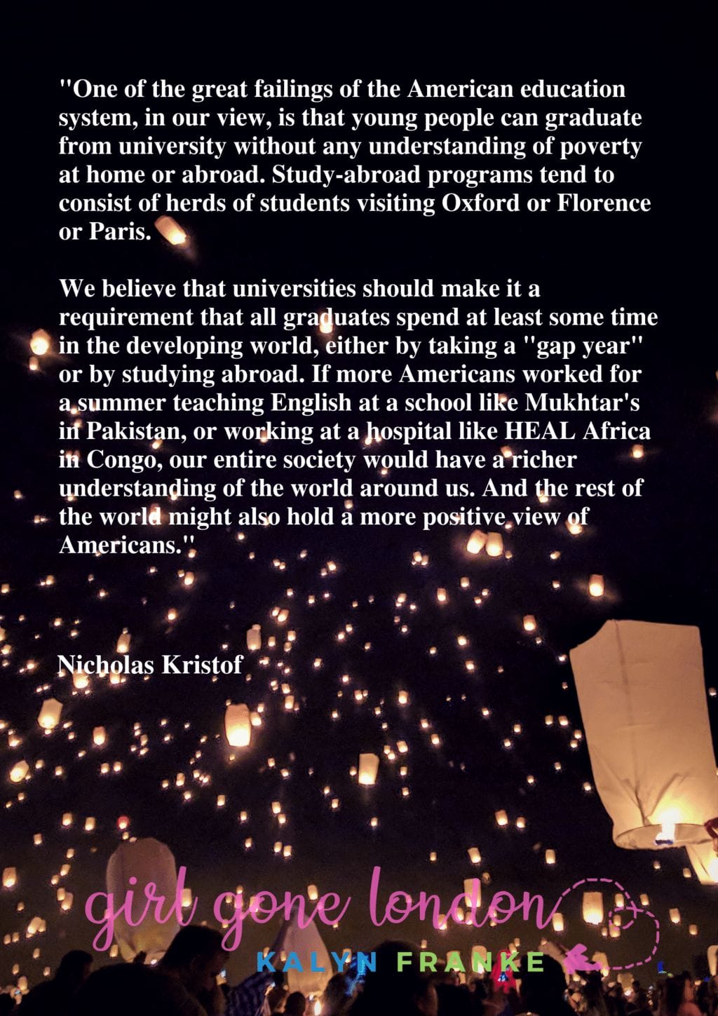 15. “One of the great failings of the American education system, in our view, is that young people can graduate from university without any understanding of poverty at home or abroad. Study-abroad programs tend to consist of herds of students visiting Oxford or Florence or Paris.