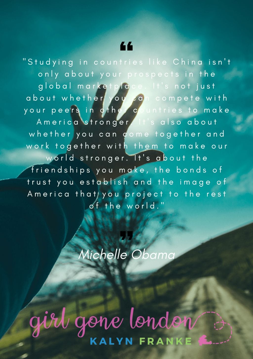 13. “Studying in countries like China isn’t only about your prospects in the global marketplace. It’s not just about whether you can compete with your peers in other countries to make America stronger. It’s also about whether you can come together and work together with them to make our world stronger. It’s about the friendships you make, the bonds of trust you establish and the image of America that you project to the rest of the world.” – Michelle Obama