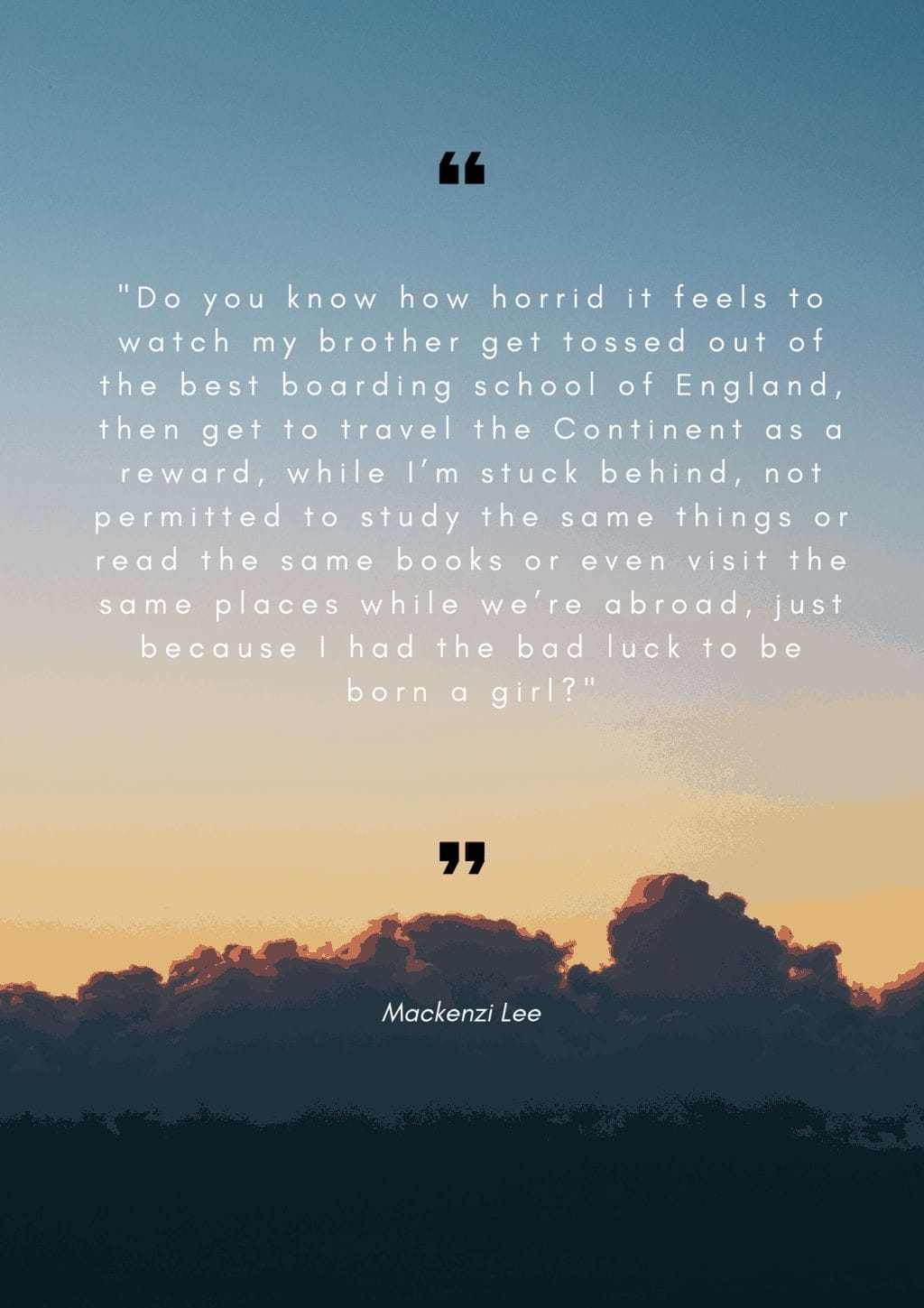 12. “Do you know how horrid it feels to watch my brother get tossed out of the best boarding school of England, then get to travel the Continent as a reward, while I’m stuck behind, not permitted to study the same things or read the same books or even visit the same places while we’re abroad, just because I had the bad luck to be born a girl?” – Mackenzi Lee