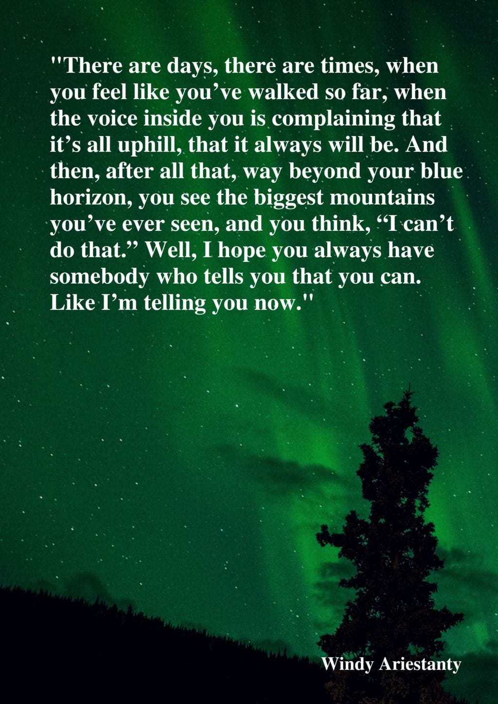 14. “There are days, there are times, when you feel like you’ve walked so far, when the voice inside you is complaining that it’s all uphill, that it always will be. And then, after all that, way beyond your blue horizon, you see the biggest mountains you’ve ever seen, and you think, “I can’t do that.” Well, I hope you always have somebody who tells you that you can. Like I’m telling you now.” – Windy Ariestanty