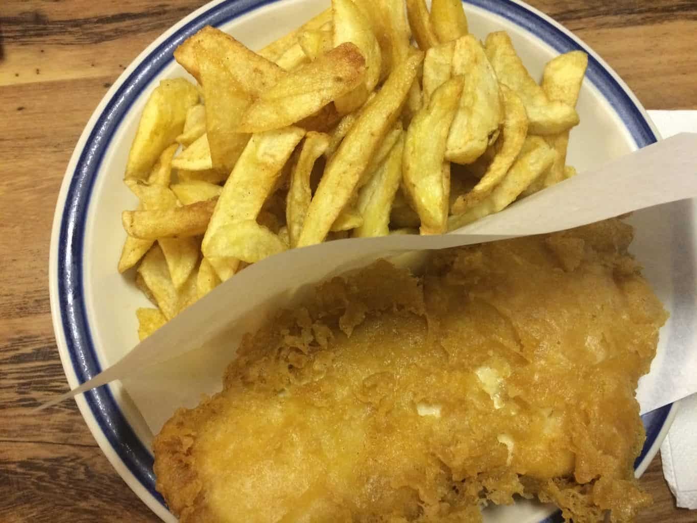 A lot of people think of fish and chips and pubs together, but for the best fish and chips, try visiting a “chippy,” which is like takeout fish and chips.