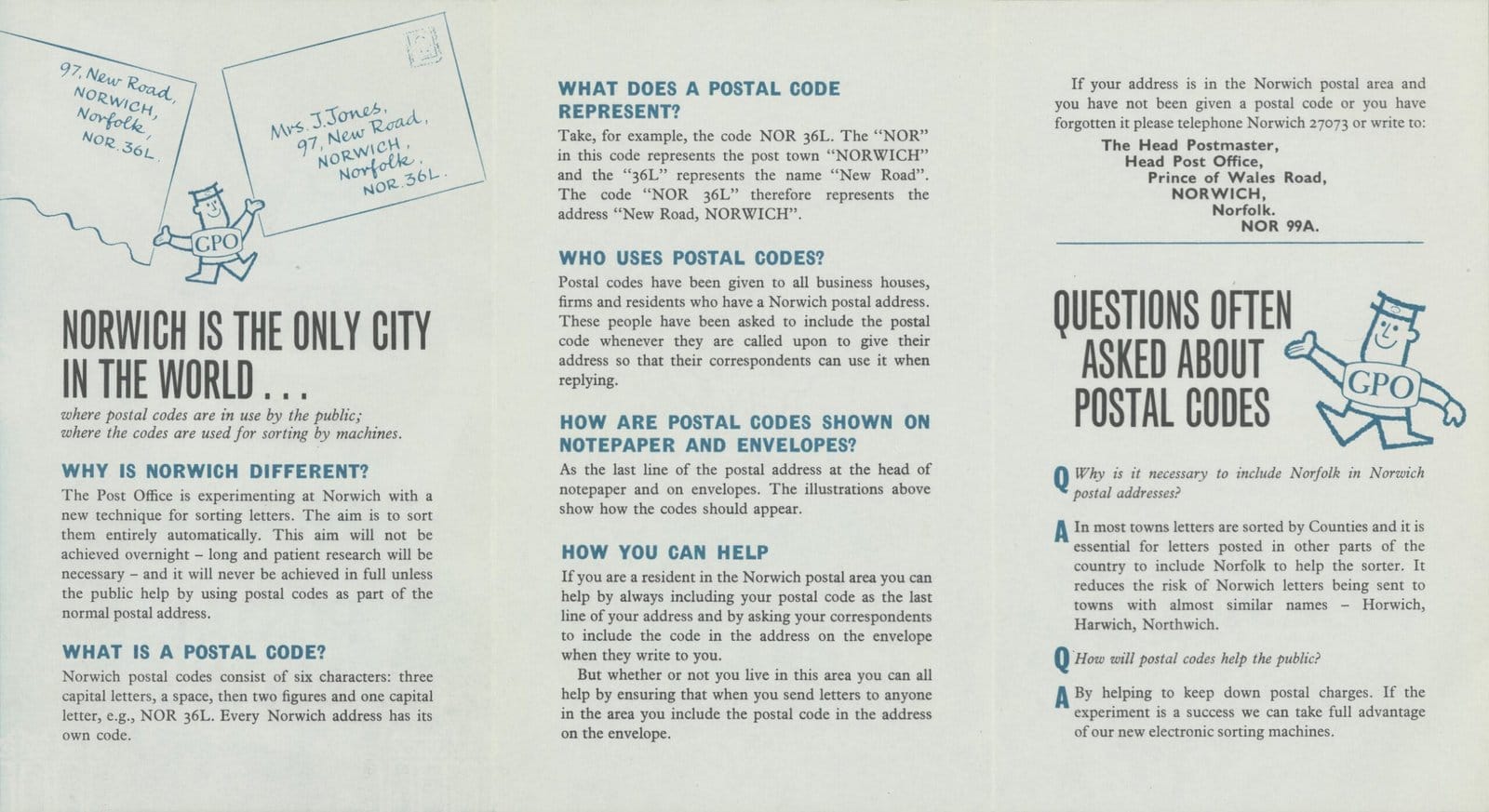 This is an interesting pamphlet showing Norwich residents more about the post code and how to use them.
