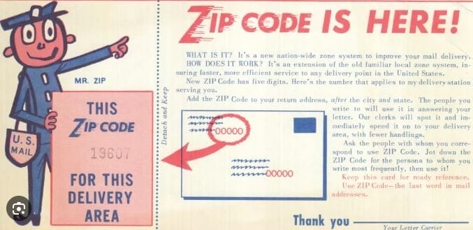 Decades later in the early 60s, the five digit ZIP code is born and introduced nationwide to help organize the mail even more, though it wasn’t mandatory at that point.